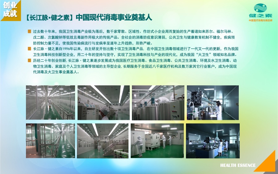 長(zhǎng)江脈·健之素自1996年以來(lái),從第一個(gè)中國(guó)首創(chuàng)開始,在中國(guó)衛(wèi)生消毒領(lǐng)域進(jìn)行一代又一代的更新,使我國(guó)的衛(wèi)生消毒科技趕上和超過(guò)國(guó)際先進(jìn)水平,實(shí)現(xiàn)了從科研、生產(chǎn)到應(yīng)用的衛(wèi)生消毒事業(yè)的現(xiàn)代化,長(zhǎng)江脈·健之素成為了我國(guó)市場(chǎng)的現(xiàn)代先鋒企業(yè)和知名品牌。