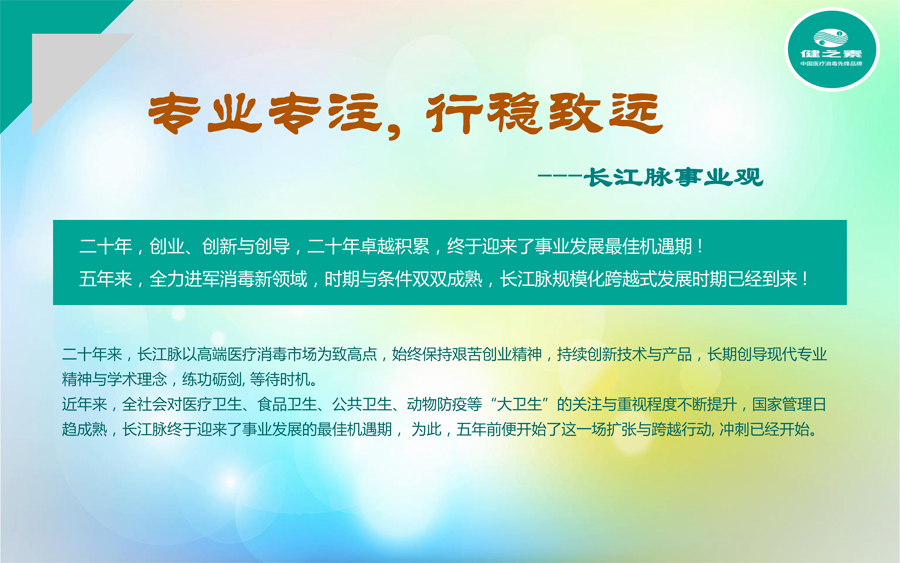 北京長江脈醫(yī)藥科技有限公司(以下簡稱“長江脈”),專注于“大衛(wèi)生”事業(yè)二十年。市場涉及醫(yī)療消毒與感染控制、食品安全、公共衛(wèi)生、環(huán)境衛(wèi)生及水衛(wèi)生、家庭衛(wèi)生、動物衛(wèi)生等領域;專業(yè)涉及化學消毒、物理消毒、生物消毒、化學污染處理、生物污染處理、微生物污染處理、微生態(tài)體系修復與重建等高科技領域。