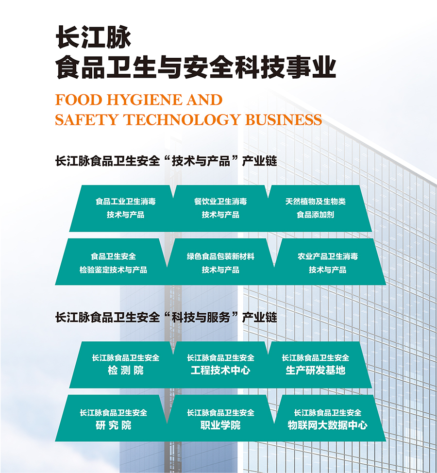 在食品安全領(lǐng)域,長江脈構(gòu)建了“產(chǎn)品與技術(shù)”產(chǎn)業(yè)鏈及 “科研與服務(wù)”產(chǎn)業(yè)鏈,“產(chǎn)品與技術(shù)”產(chǎn)業(yè)鏈包括:食品工業(yè)衛(wèi)生消毒技術(shù)與產(chǎn)品、餐飲業(yè)衛(wèi)生消毒技術(shù)與產(chǎn)品、天然植物及生物類食品添加劑、食品衛(wèi)生安全檢驗鑒定技術(shù)與產(chǎn)品、綠色食品包裝新材料技術(shù)與產(chǎn)品、農(nóng)業(yè)產(chǎn)品衛(wèi)生消毒技術(shù)與產(chǎn)品。“科技與服務(wù)”產(chǎn)業(yè)鏈包括:長江脈食品衛(wèi)生安全檢測院、長江脈食品衛(wèi)生安全工程技術(shù)中心、長江脈食品衛(wèi)生安全研究院、長江脈食品衛(wèi)生安全職業(yè)學院、長江脈食品衛(wèi)生安全物聯(lián)網(wǎng)大數(shù)據(jù)中心。并以 “全案技術(shù)服務(wù)”及“全案技術(shù)實施”為主要市場服務(wù)模式,全方位服務(wù)于食品產(chǎn)業(yè)各領(lǐng)域。