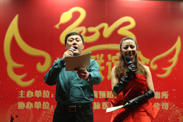 聯(lián)歡會主持人王勁(北京市疾控中心)、伍 嬋(長江脈公司)