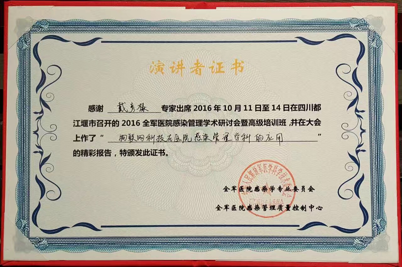 2016年10月11日一14日,“2016全軍醫(yī)院感染管理學(xué)術(shù)研討會(huì)及高級(jí)培訓(xùn)班”在四川都江堰市召開,北京長(zhǎng)江脈醫(yī)藥科技有限公司董事長(zhǎng)戴彥榛先生應(yīng)邀出席,并為大會(huì)作了“現(xiàn)代物聯(lián)網(wǎng)科技在醫(yī)院感染學(xué)科的應(yīng)用”的精彩學(xué)術(shù)報(bào)告。