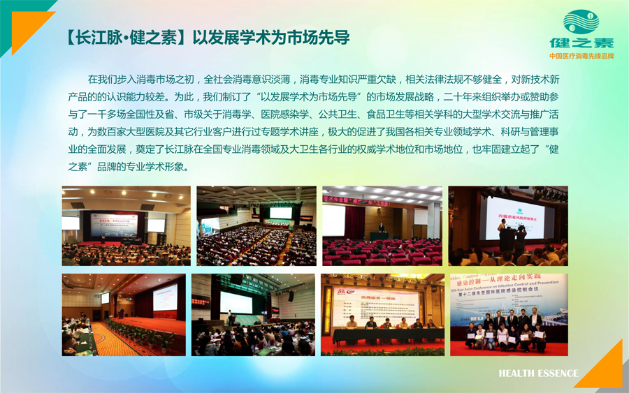 在我們步入消毒市場之初,全社會消毒意識淡薄,消毒專業(yè)知識嚴重欠缺,相關法律法規(guī)不夠健全,對新技術新產(chǎn)品的的認識能力較差。為此,我們制訂了“以發(fā)展學術為市場先導”的市場發(fā)展戰(zhàn)略,二十年來組織舉辦或贊助參與了一千多場全國性及省、市級關于消毒學、醫(yī)院感染學、公共衛(wèi)生、食品衛(wèi)生等相關學科的大型學術交流與推廣活動,為數(shù)百家大型醫(yī)院及其它行業(yè)客戶進行過專題學術講座,極大的促進了我國各相關專業(yè)領域學術、科研與管理事業(yè)的全面發(fā)展,奠定了長江脈在全國專業(yè)消毒領域及大衛(wèi)生各行業(yè)的權威學術地位和市場地位,也牢固建立起了“健之素”品牌的專業(yè)學術形象。